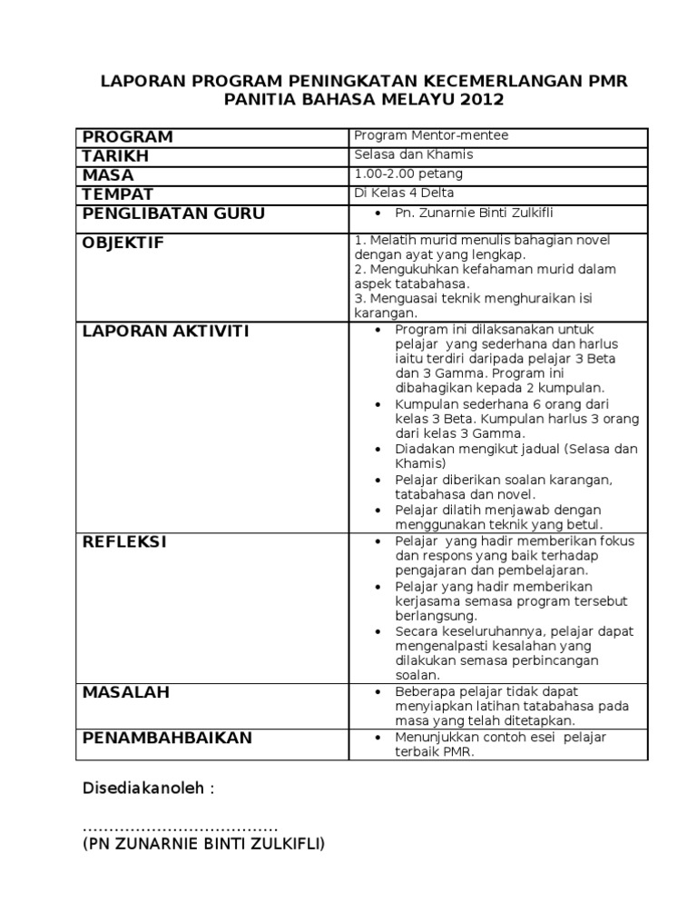 Laporan Ringkas Program Peningkatan Kecemerlangan Pmr Panitia Bahasa Melayu 2012mentormntee Pdf